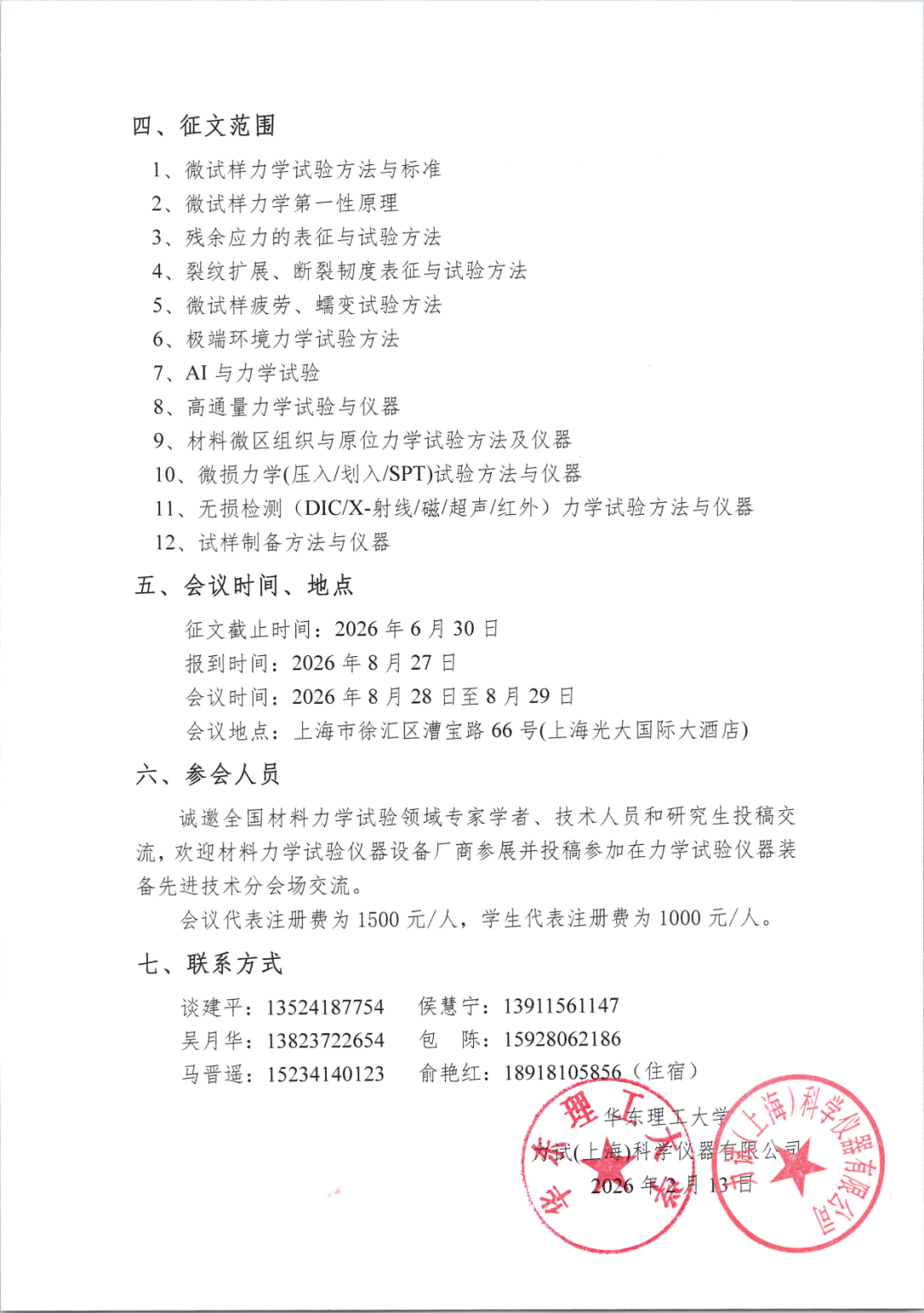 为了进一步推动我国材料微试样力学性能测试领域学术研讨及力学试验仪器装备技术与创新交流,促进试验方法标准化工作,拟定于2026年8月27日~29日在上海召开第4届微试样力学试验方法学术与技术研讨会暨第2届中国力学试验仪器装备创新交流会。本次会议面向材料微试样力学性能测试领域的新理论、新技术和新试验方法标准化以及力学试验先进仪器装备技术与创新提供全国性交流与展示平台,特向全国相关领域的学者、企业家、专家、技术人员、研究生征文并邀请中外力学试验仪器装备企业参展。